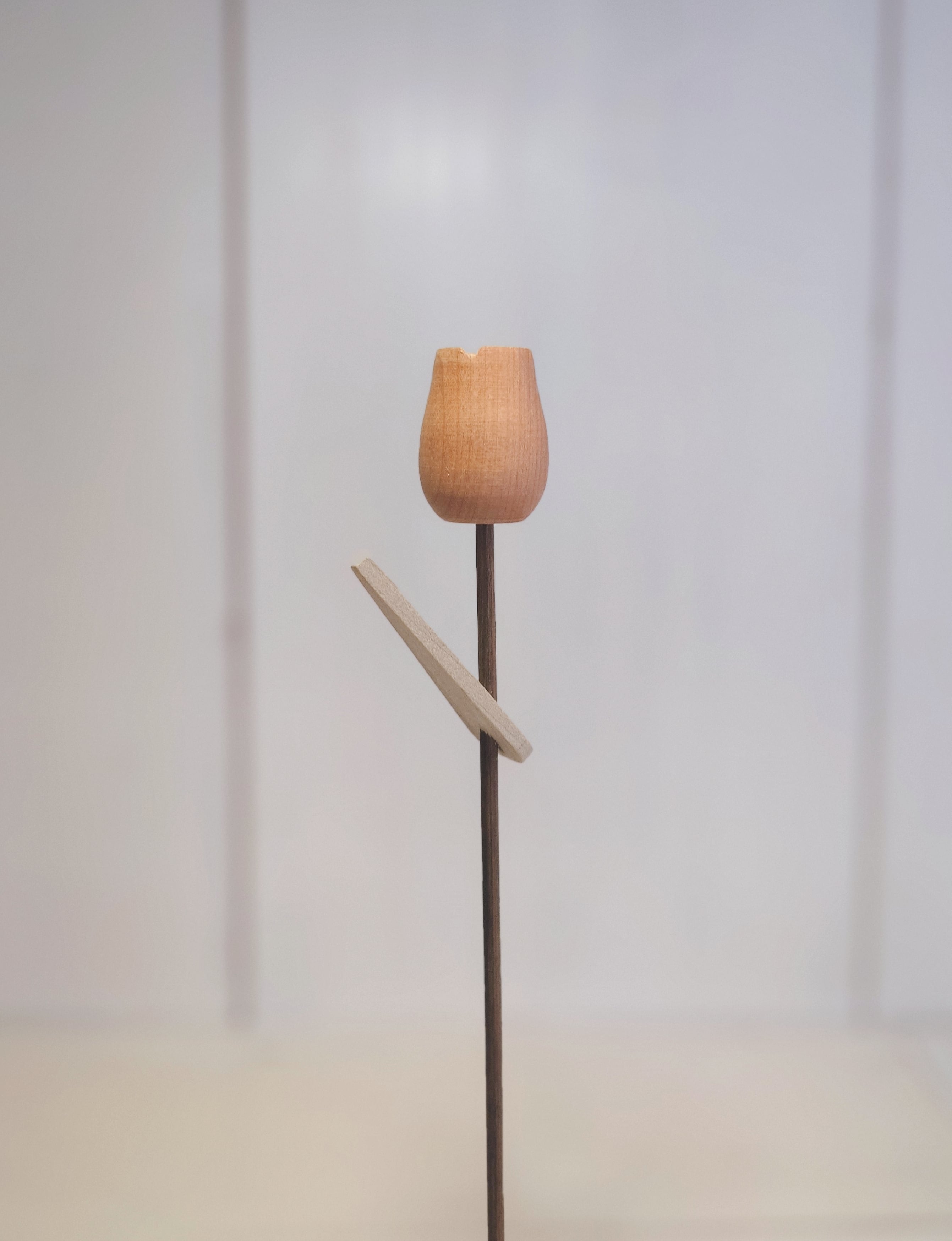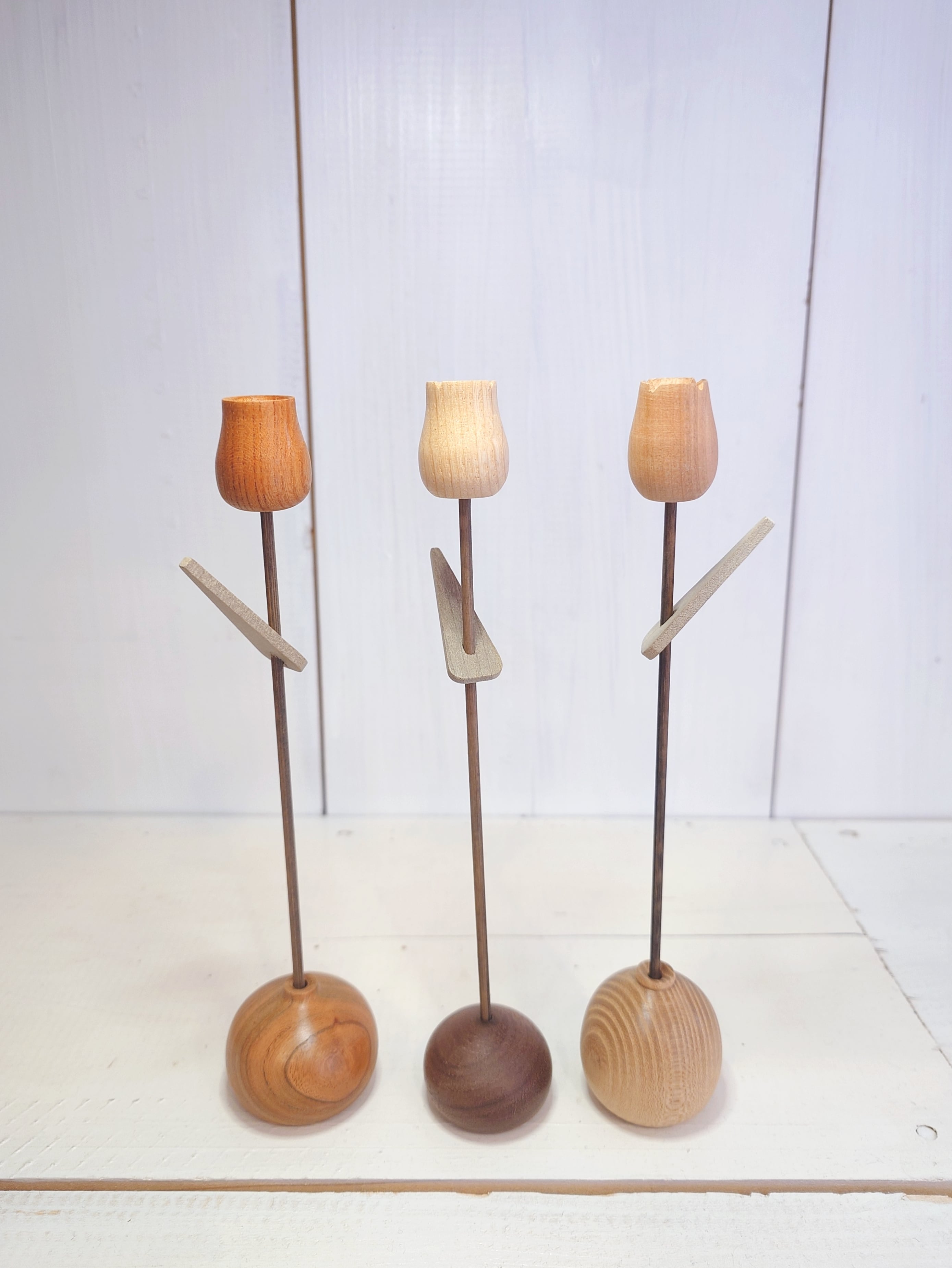 花は黄褐色の木目が美しいケヤキ、くっきりした木目の衝撃に強いホワイトアッシュ、グラデーションの色調が美しい桜を使用したチューリップのオブジェです。