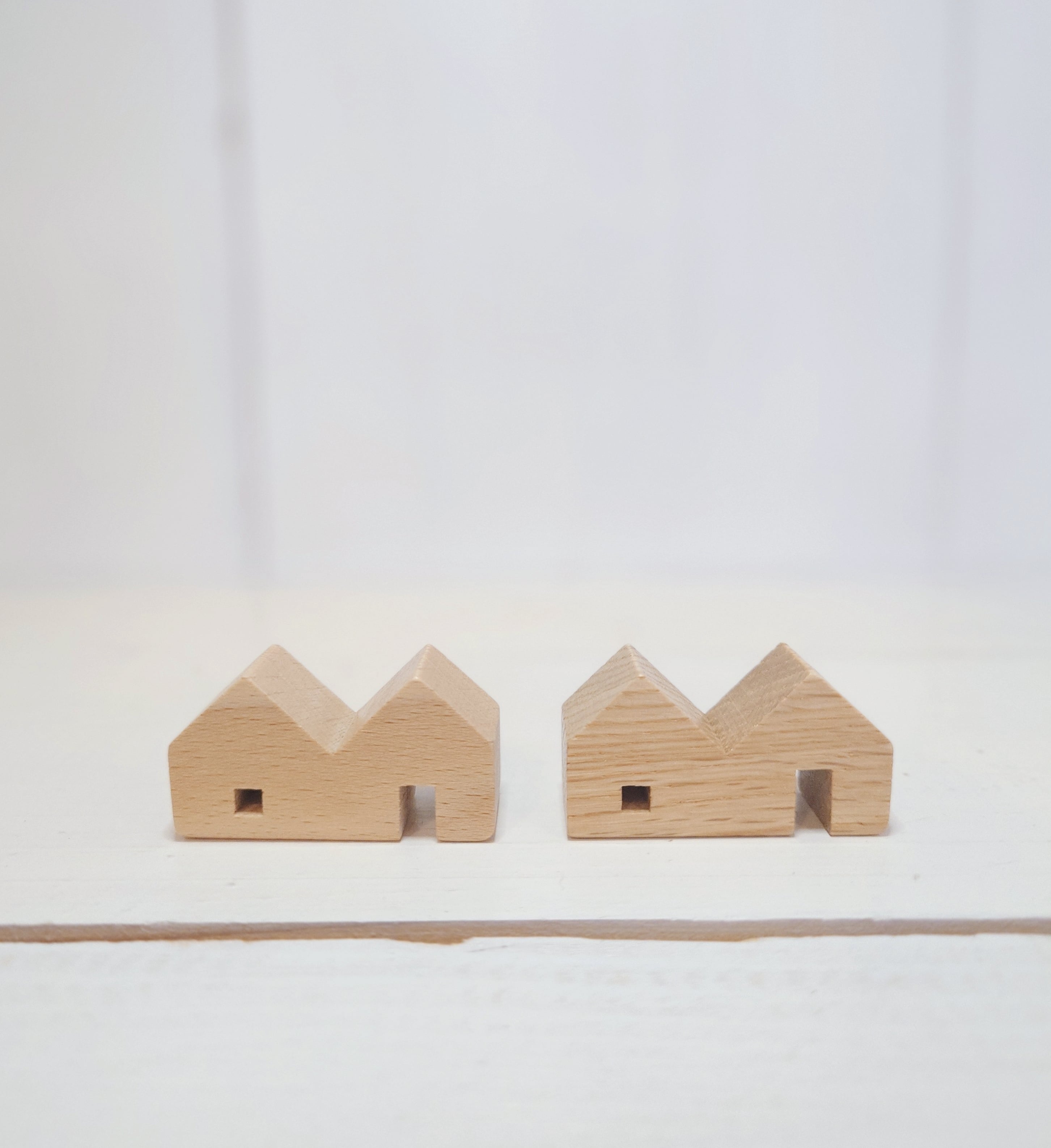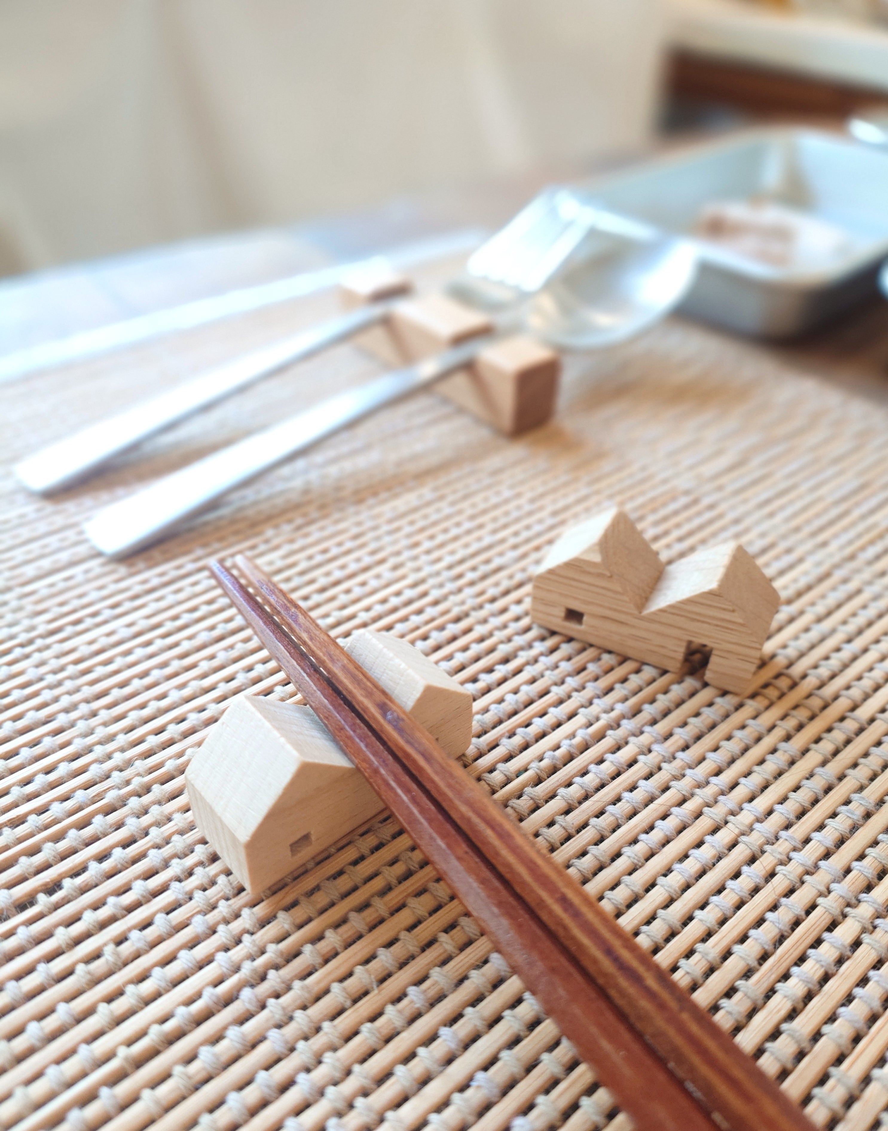 ピンクがかった白い木肌に細かい木目が特徴的なブナと、淡い褐色の重硬なナラを使用した箸置きです。
